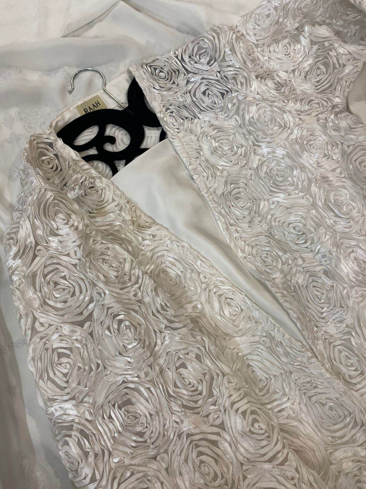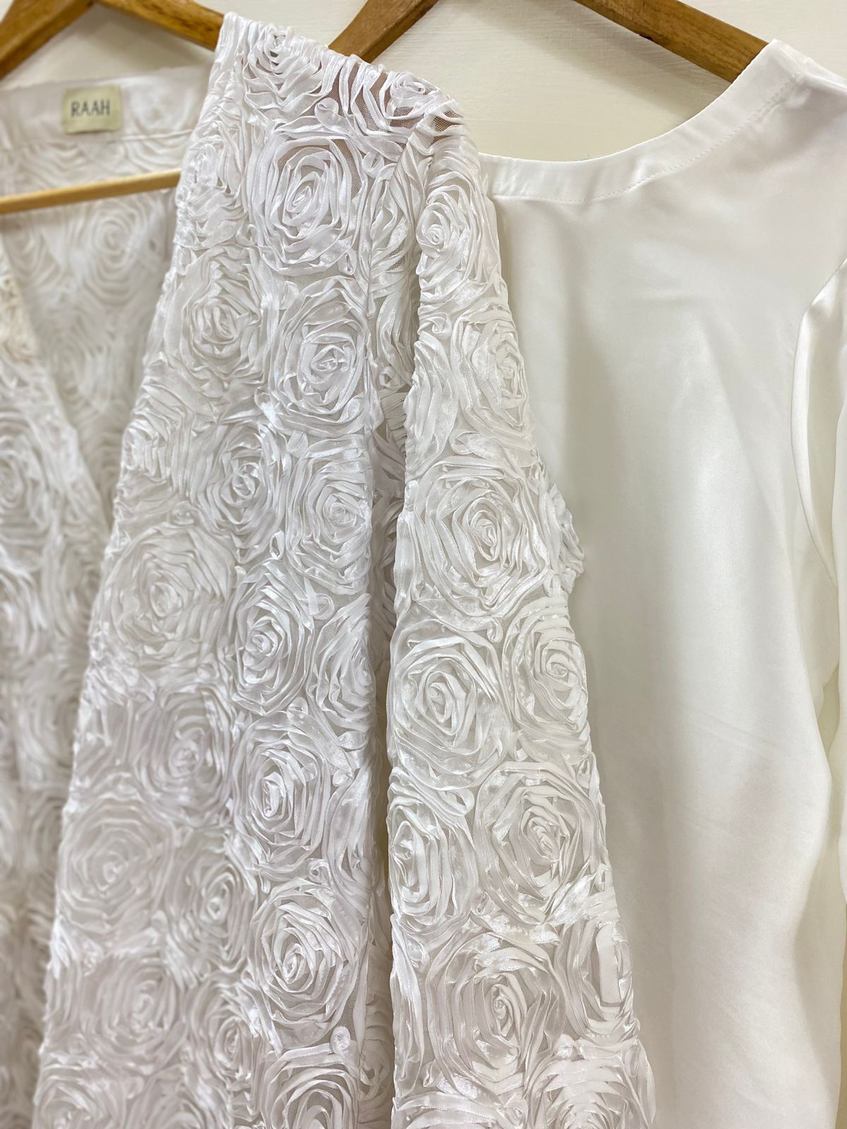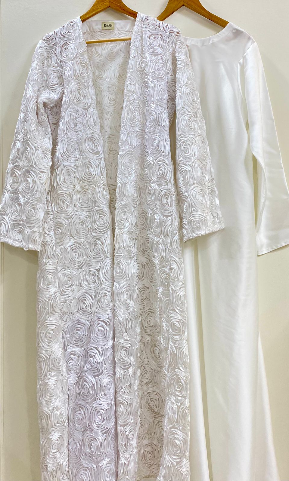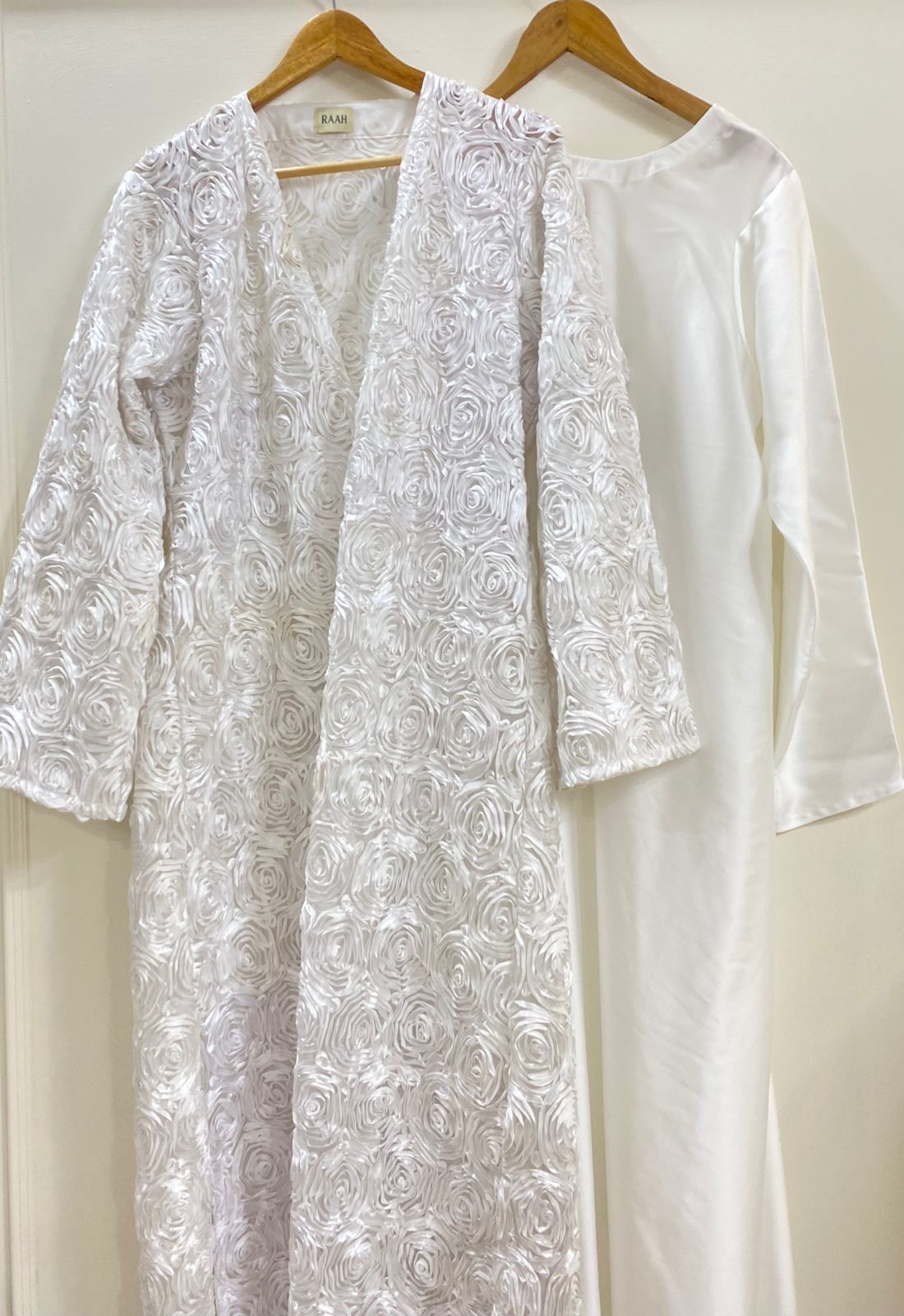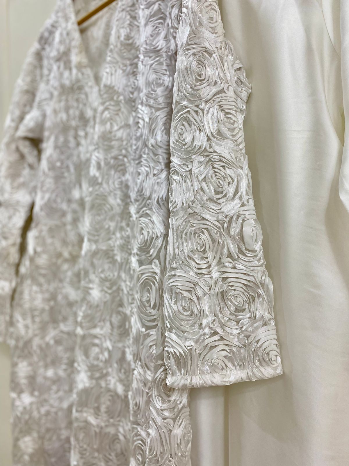 This 3-piece Abaya set includes an upper, slip dress, and hijab. The dress is made in premium net satin fabric with ribbon-work rose pattern all over. The 3D roses add a touch of glamour and luxury while providing greater flexibility of movement. Crafted with attention to detail, it is perfect for special occasions/nikkah.