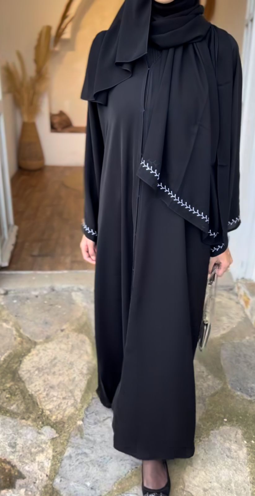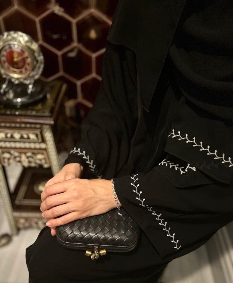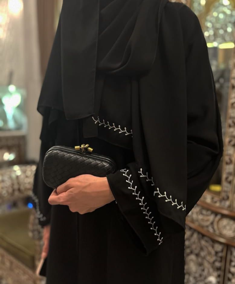 A black premium nada abaya featuring delicate embroidered sleeves. Feminine, graceful, and ideal for daily use.