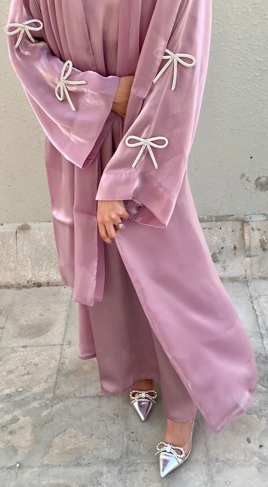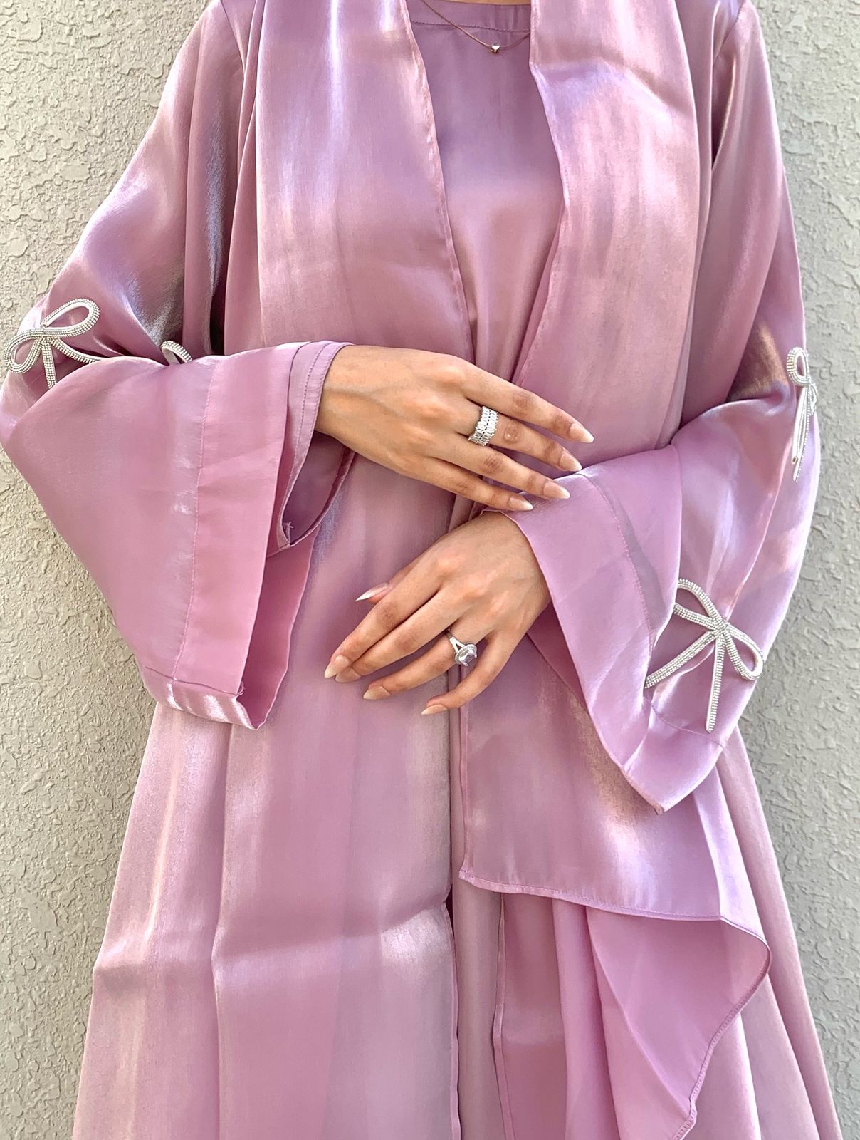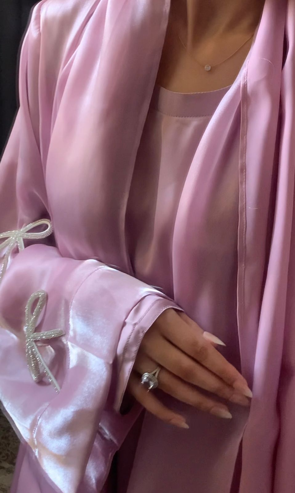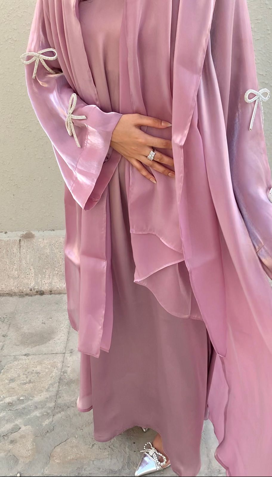 Crafted from our favorite lightweight shein silk fabric, this 3-piece abaya set is designed for effortless elegance. It features a full-sleeved inner slip dress and a flowing open outer abaya with bell sleeves. The lilac hue is the perfect pop of color for formal parties and dinners, fresh, breathable, and flattering. Finished with a matching shein silk hijab for a complete, coordinated look.